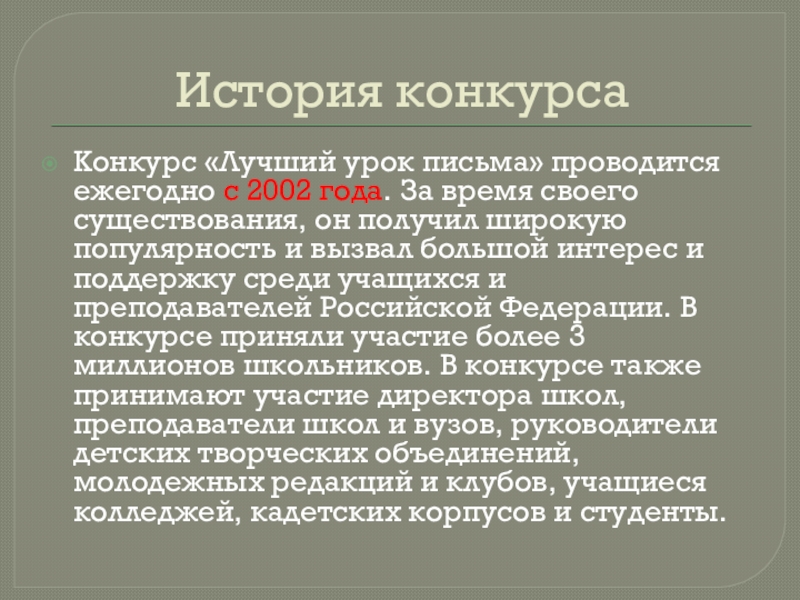 История конкурсаКонкурс «Лучший урок письма» проводится ежегодно с 2002 года. За время своего существования, он получил широкую