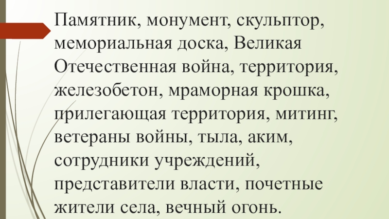 Слайд 4Памятник, монумент, скульптор, мемориальная доска, Великая Отечественная война, территория, железобетон, мраморная