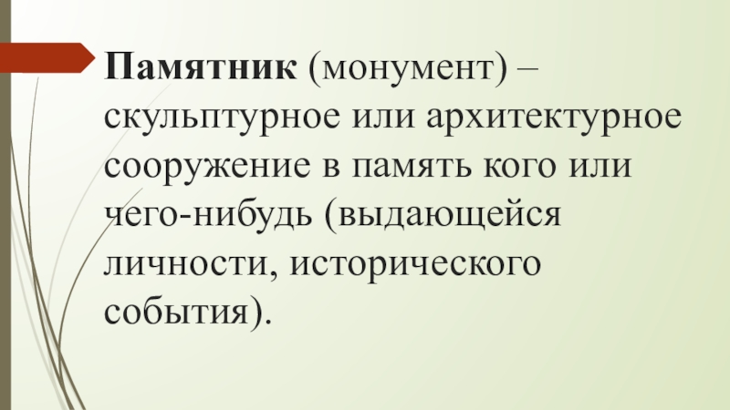 Памятник (монумент) – скульптурное или архитектурное сооружение в память кого или чего-нибудь (выдающейся личности, исторического события).