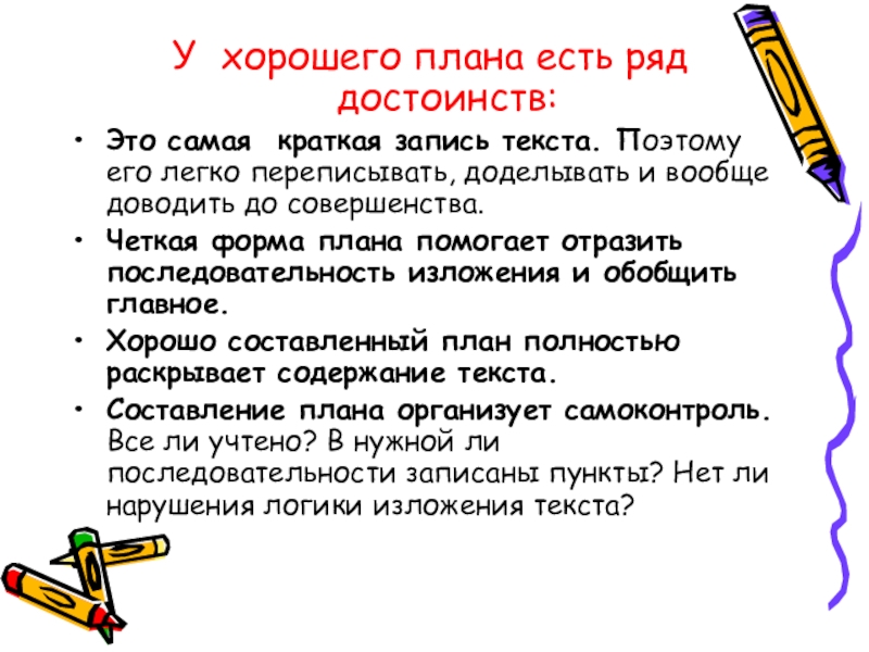 У  хорошего плана есть ряд достоинств:Это самая  краткая запись текста. Поэтому его легко переписывать, доделывать и вообще
