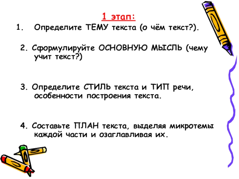 1 этап:Определите ТЕМУ текста (о чём текст?).2. Сформулируйте ОСНОВНУЮ МЫСЛЬ (чему учит текст?)  3. Определите СТИЛЬ текста и ТИП речи, особенности