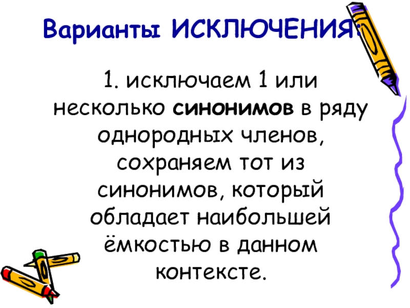 Слайд 11Варианты ИСКЛЮЧЕНИЯ: 1. исключаем 1 или несколько синонимов в ряду однородных членов,