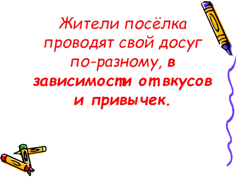 Слайд 19 Жители посёлка проводят свой досуг по-разному, в зависимости от