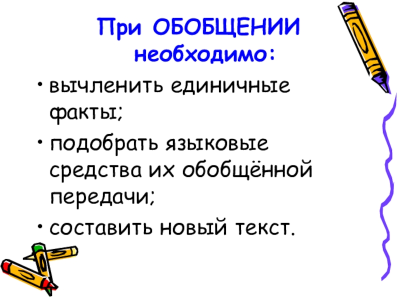 При ОБОБЩЕНИИ необходимо:вычленить единичные факты;подобрать языковые средства их обобщённой передачи;составить новый текст.