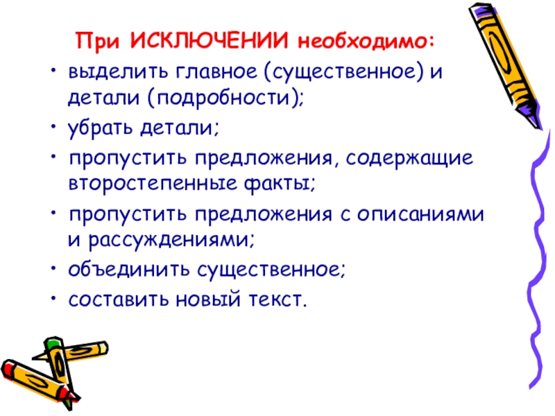 При ИСКЛЮЧЕНИИ необходимо:выделить главное (существенное) и детали (подробности);убрать детали;пропустить предложения, содержащие второстепенные факты;пропустить предложения с описаниями