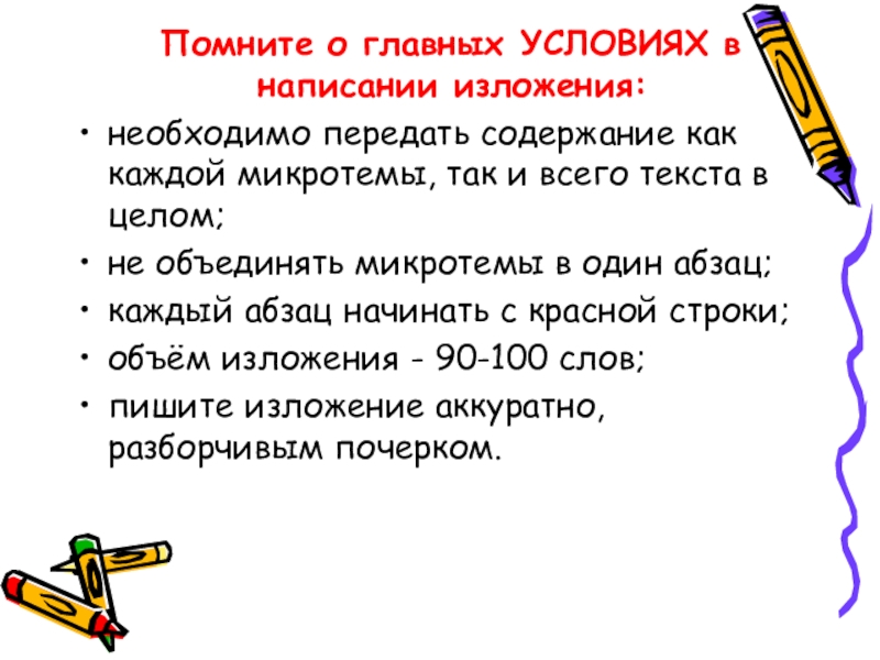Помните о главных УСЛОВИЯХ в написании изложения:необходимо передать содержание как каждой микротемы, так и всего текста в