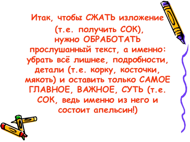 Итак, чтобы СЖАТЬ изложение (т.е. получить СОК), нужно ОБРАБОТАТЬ прослушанный текст, а именно: убрать всё лишнее, подробности, детали (т.е. корку, косточки, мякоть) и оставить только САМОЕ ГЛАВНОЕ, ВАЖНОЕ, СУТЬ (т.е. СОК, ведь именно из него и
