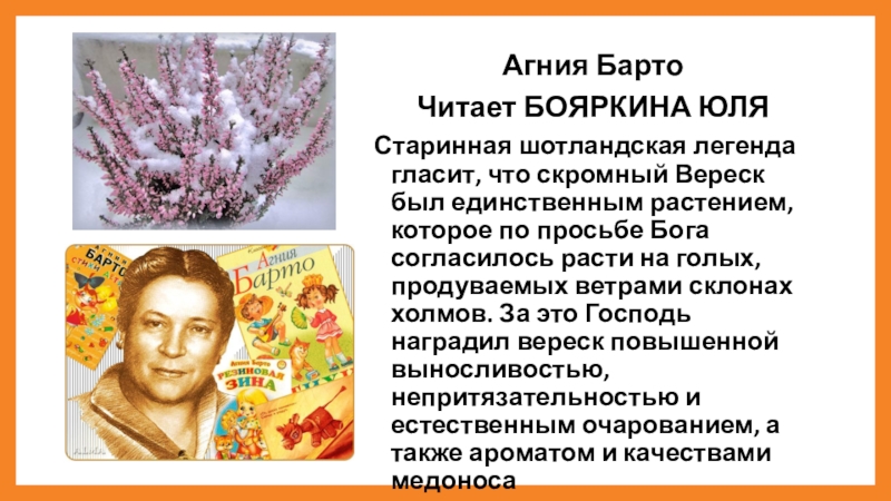 Агния БартоЧитает БОЯРКИНА ЮЛЯСтаринная шотландская легенда гласит, что скромный Вереск был единственным растением, которое по просьбе Бога