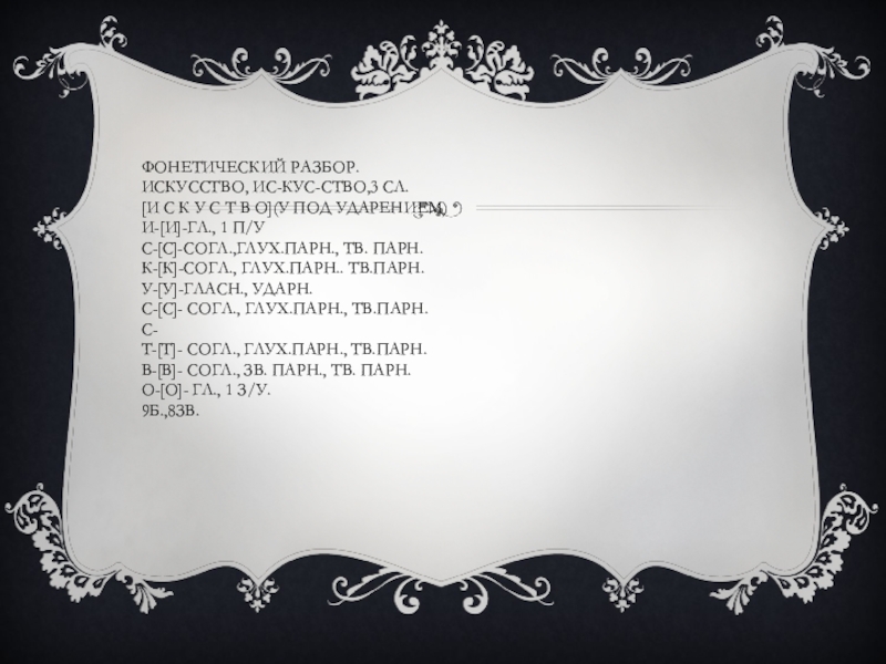 Фонетический разбор. Искусство, ис-кус-ство,3 сл. [и с к у с т в о](у под ударением) и-[и]-гл., 1