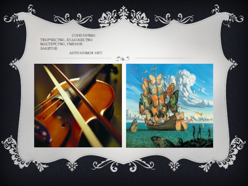 Синонимы: творчество, художество мастерство, умение занятие Антонимов нет.