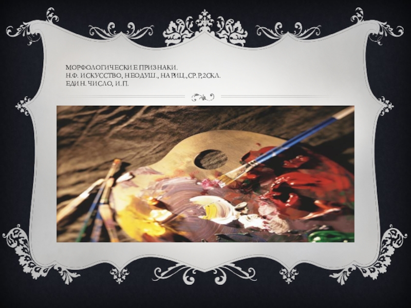 Слайд 4Морфологические признаки. Н.ф. искусство, неодуш., нариц.,ср.р,2скл. Един. Число, и.п.