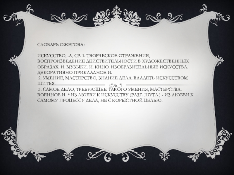 Слайд 2Словарь Ожегова: искусство, -а, ср. 1. творческое отражение, воспроизведение действительности в художественных