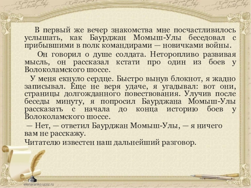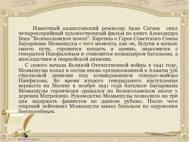 под командованием Героя Совет-ского Союза Ивана Васильевича Панфилова. О подвигах Б.Момы-шулы написано немало книг. Самое известное произведение это повесть Александра Бека «Волоко-ламское шоссе» о героизме совет-ских воинов у деревни Матронино. Главным действующим лицом этой повести был офицер- панфиловец, герой обороны Москвы Бауржан Момышулы. Александр Бек – соз-дал эту книгу по его рассказам и воспоминаниям. Эта книга переве-дена на немецкий, чешский, еврей-ский, английский, французский и другие языки мира.
