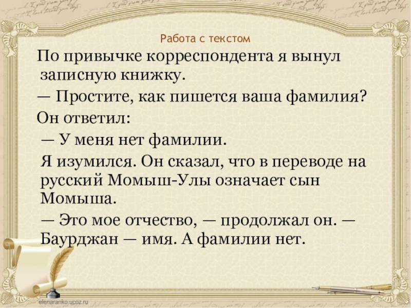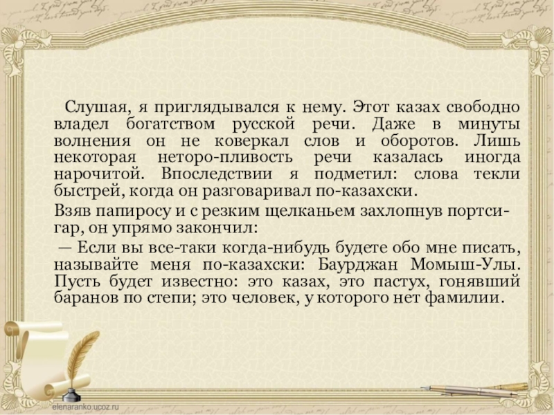 Слайд 19 Слушая, я приглядывался к нему. Этот казах свободно