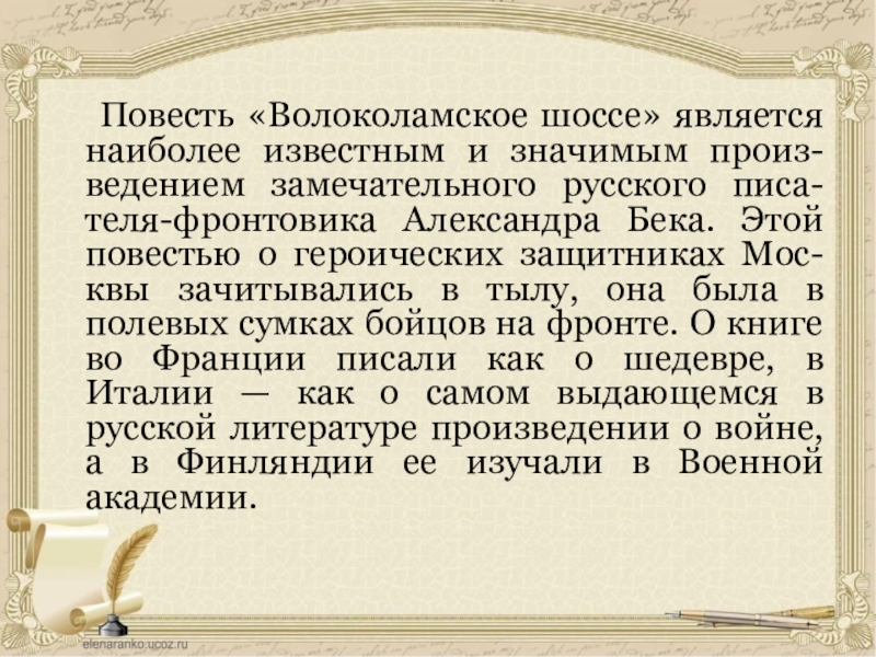 замечательного русского писа-теля-фронтовика Александра Бека. Этой повестью о героических защитниках Мос-квы зачитывались в тылу, она была в полевых сумках бойцов на фронте. О книге во Франции писали как о шедевре, в Италии — как о самом выдающемся в русской литературе произведении о войне, а в Финляндии ее изучали в Военной академии.