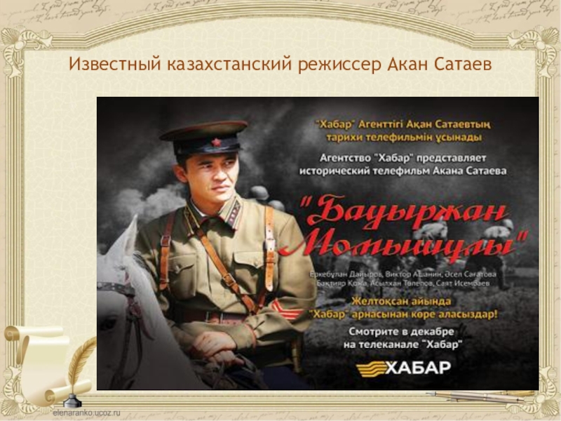 Слайд 12 Известный казахстанский режиссер Акан Сатаев снял четырехсерийный