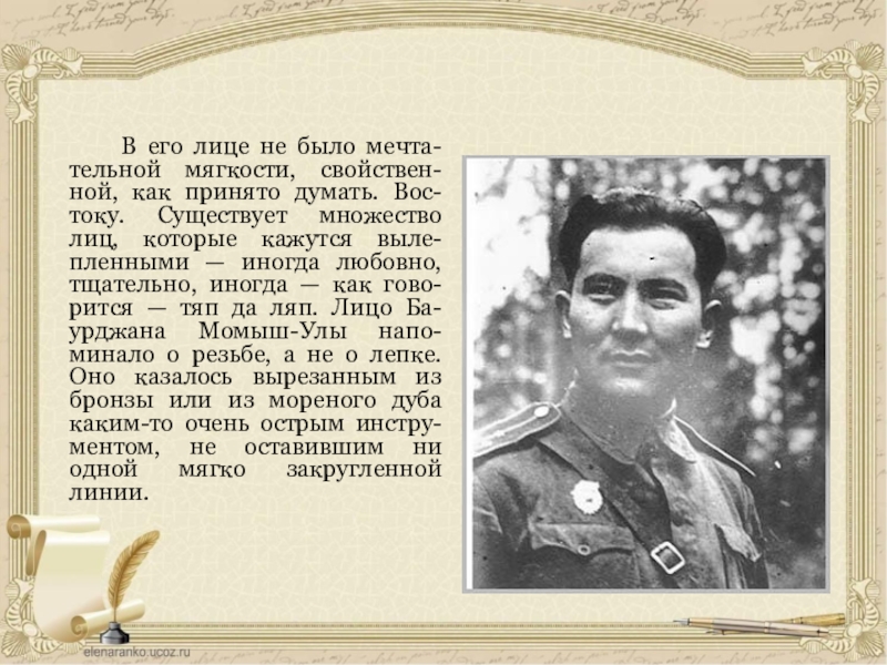 — Если вы все-таки когда-нибудь будете обо мне писать, называйте меня по-казахски: Баурджан Момыш-Улы. Пусть будет известно: это казах, это пастух, гонявший баранов по степи; это человек, у которого нет фамилии.