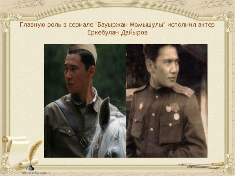 Слайд 14Главную роль в сериале "Бауыржан Момышулы" исполнил актер Еркебулан Дайыров