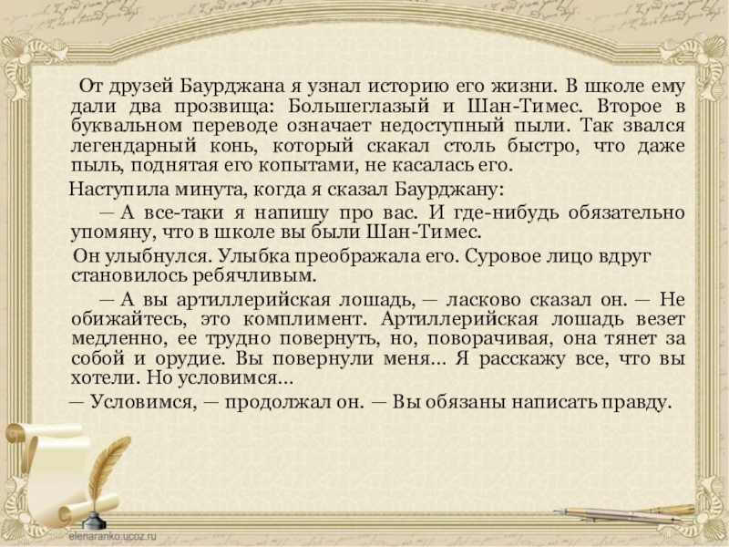 Слайд 21 От друзей Баурджана я узнал историю его жизни.