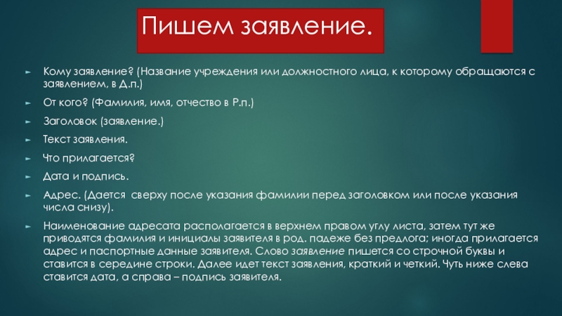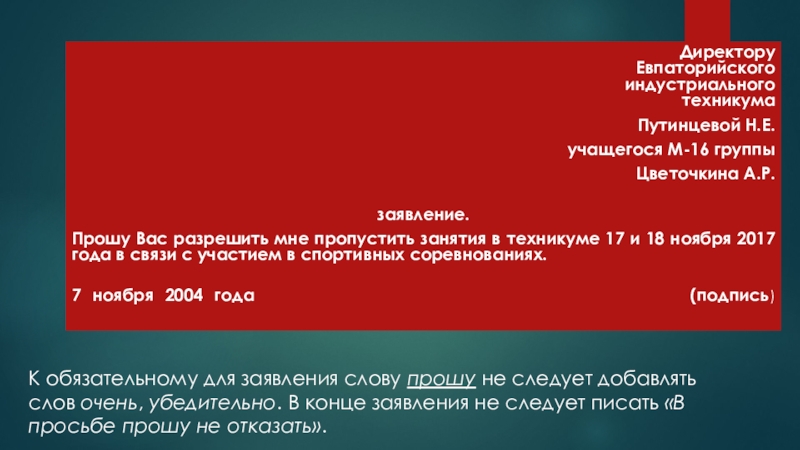 К обязательному для заявления слову прошу не следует добавлять слов очень, убедительно. В конце заявления не следует писать «В просьбе прошу не отказать».