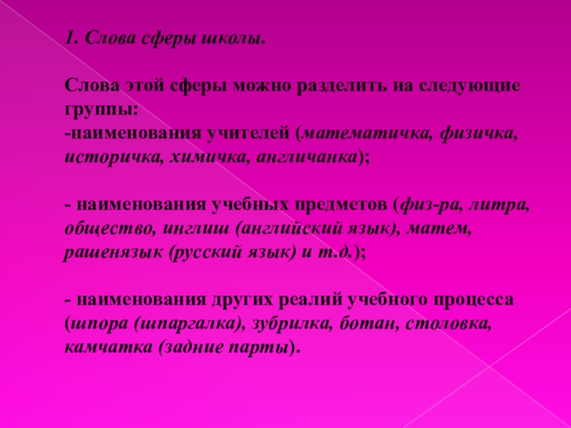 - наименования других реалий учебного процесса (шпора (шпаргалка), зубрилка, ботан, столовка, камчатка (задние парты).