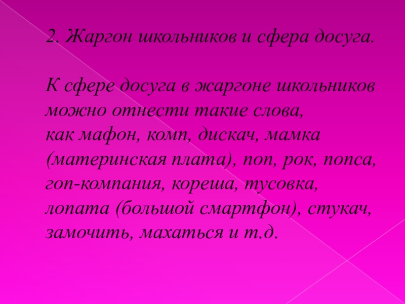 можно отнести такие слова, как мафон, комп, дискач, мамка (материнская плата), поп, рок, попса, гоп-компания, кореша, тусовка, лопата (большой смартфон), стукач, замочить, махаться и т.д.