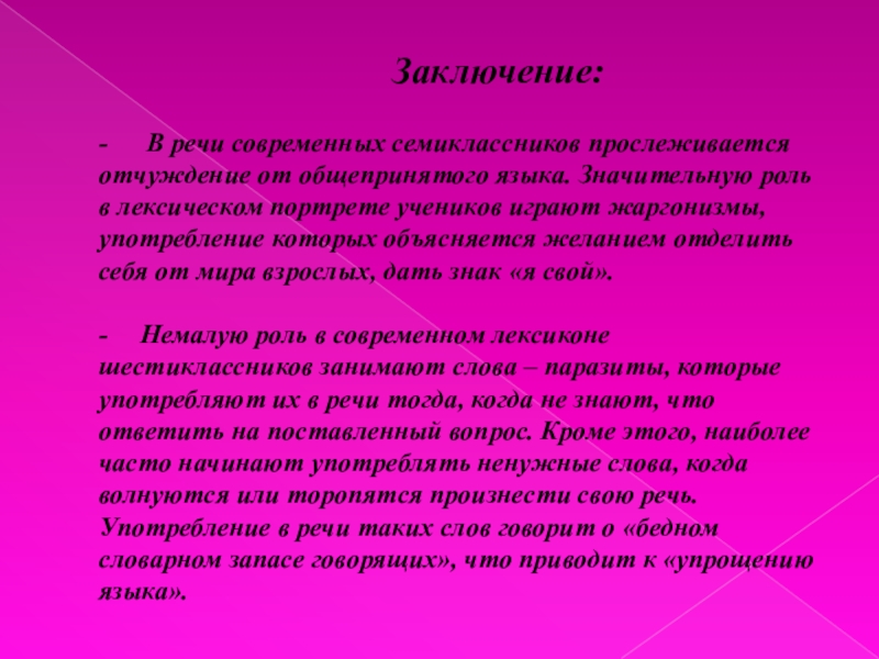 - В речи современных семиклассников прослеживается отчуждение от общепринятого языка. Значительную роль в лексическом портрете учеников играют жаргонизмы, употребление которых объясняется желанием отделить себя от мира взрослых, дать знак «я свой».