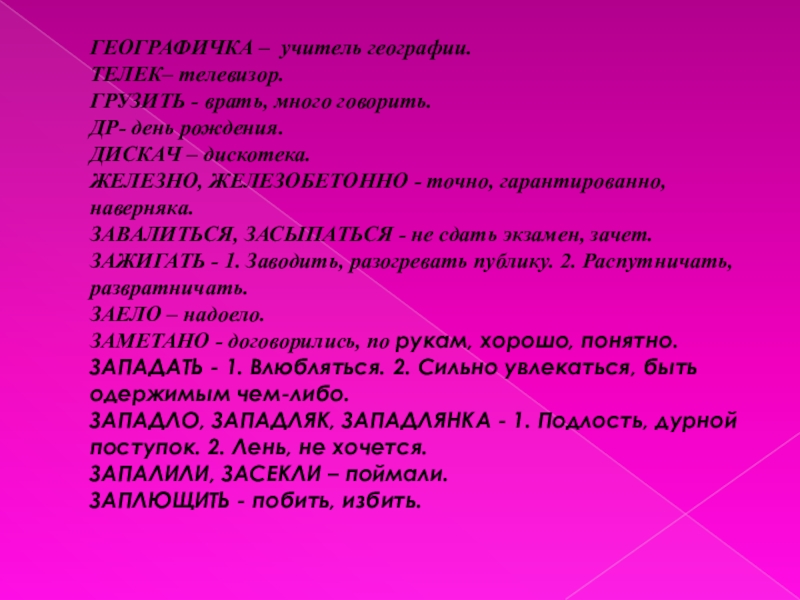 - наименования учебных предметов (физ-ра, литра, общество, инглиш (английский язык), матем, рашенязык (русский язык) и т.д.);