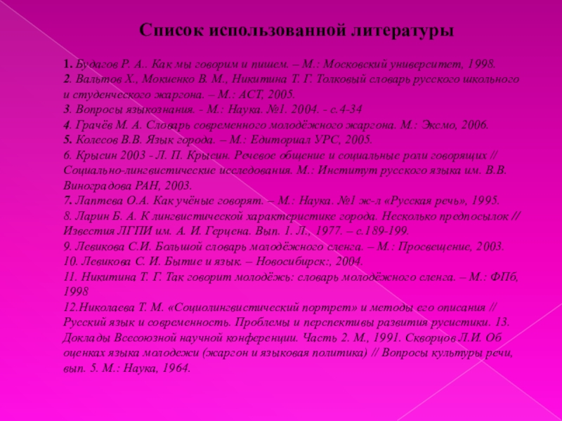 12.Николаева Т. М. «Социолингвистический портрет» и методы его описания // Русский язык и современность. Проблемы и перспективы развития русистики. 13. Доклады Всесоюзной научной конференции. Часть 2. М., 1991. Скворцов Л.И. Об оценках языка молодежи (жаргон и языковая политика) // Вопросы культуры речи, вып. 5. М.: Наука, 1964.