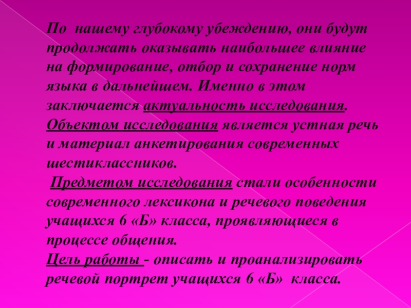 Предметом исследования стали особенности современного лексикона и речевого поведения учащихся 6 «Б» класса, проявляющиеся в процессе общения.