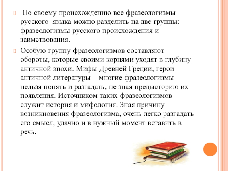 Особую группу фразеологизмов составляют обороты, которые своими корнями уходят в глубину античной эпохи. Мифы Древней Греции, герои античной литературы – многие фразеологизмы нельзя понять и разгадать, не зная предысторию их появления. Источником таких фразеологизмов служит история и мифология. Зная причину возникновения фразеологизма, очень легко разгадать его смысл, удачно и в нужный момент вставить в речь.