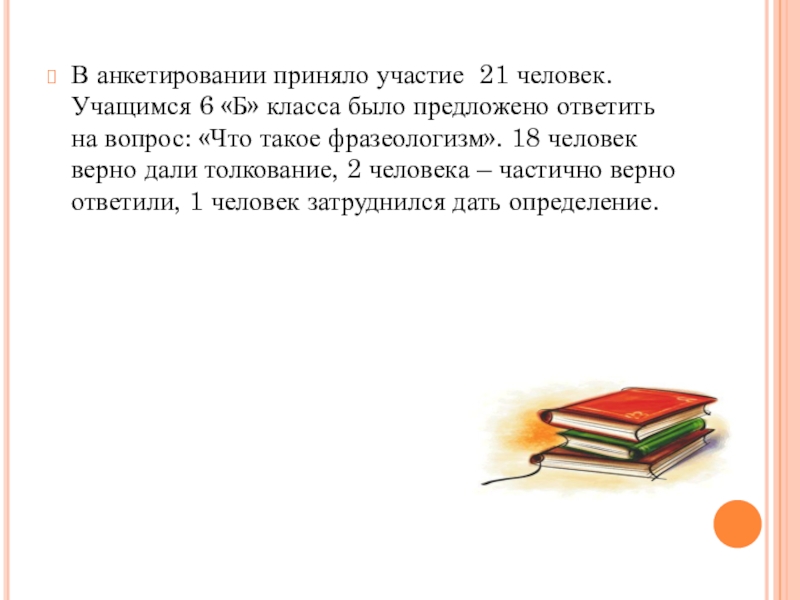 Слайд 14В анкетировании приняло участие 21 человек. Учащимся 6 «Б» класса было