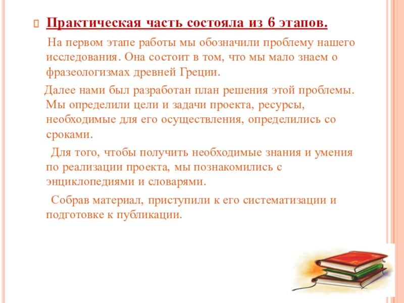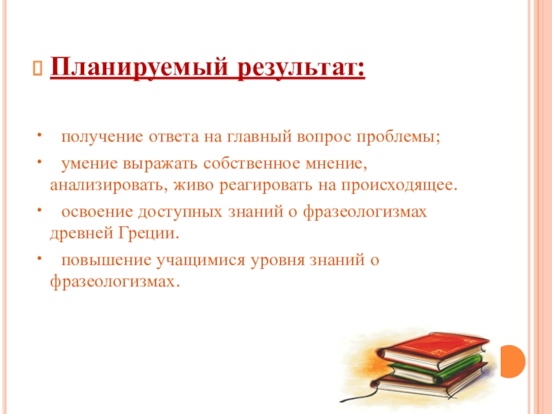 Цель, поставленная в работе, достигнута. Гипотеза, о том, что работа над данным проектом углубит знания о фразеологизмах, расширит наш речевой кругозор, научит разграничивать исконно русские и древнегреческие фразеологизмы, подтвердилась.