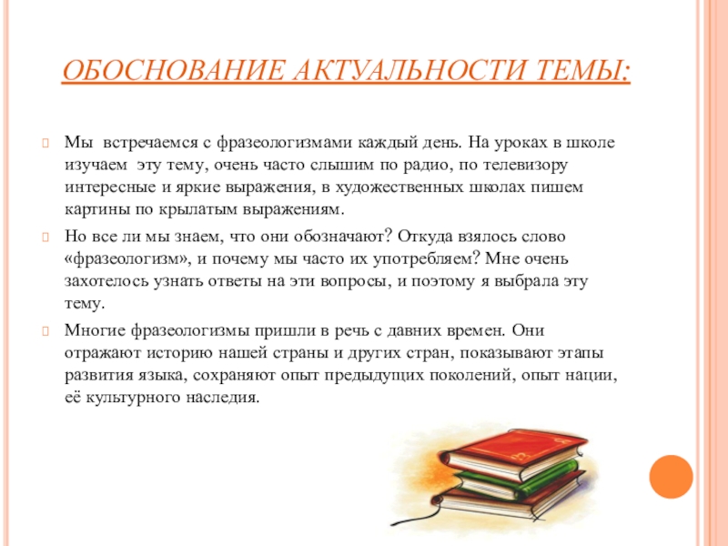Но все ли мы знаем, что они обозначают? Откуда взялось слово «фразеологизм», и почему мы часто их употребляем? Мне очень захотелось узнать ответы на эти вопросы, и поэтому я выбрала эту тему.