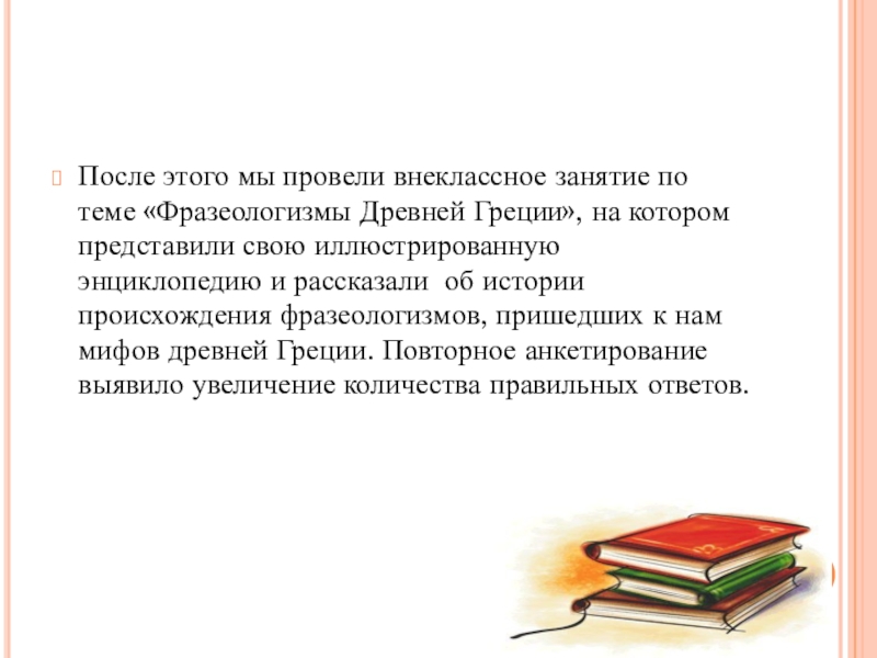 на котором представили свою иллюстрированную энциклопедию и рассказали об истории происхождения фразеологизмов, пришедших к нам мифов древней Греции. Повторное анкетирование выявило увеличение количества правильных ответов.