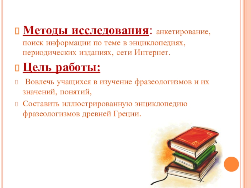 Слайд 6Методы исследования: анкетирование, поиск информации по теме в энциклопедиях, периодических изданиях,