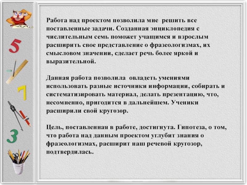 Цель, поставленная в работе, достигнута. Гипотеза, о том, что работа над данным проектом углубит знания о фразеологизмах, расширит наш речевой кругозор, подтвердилась.