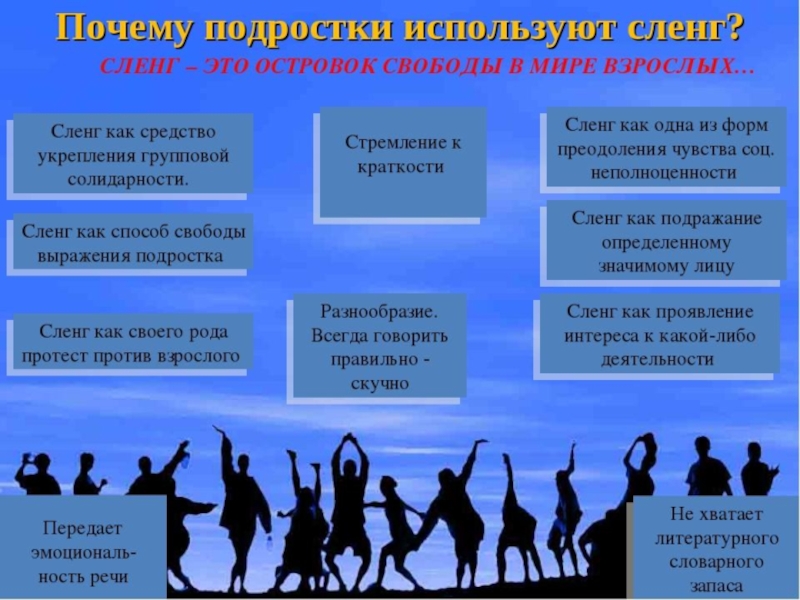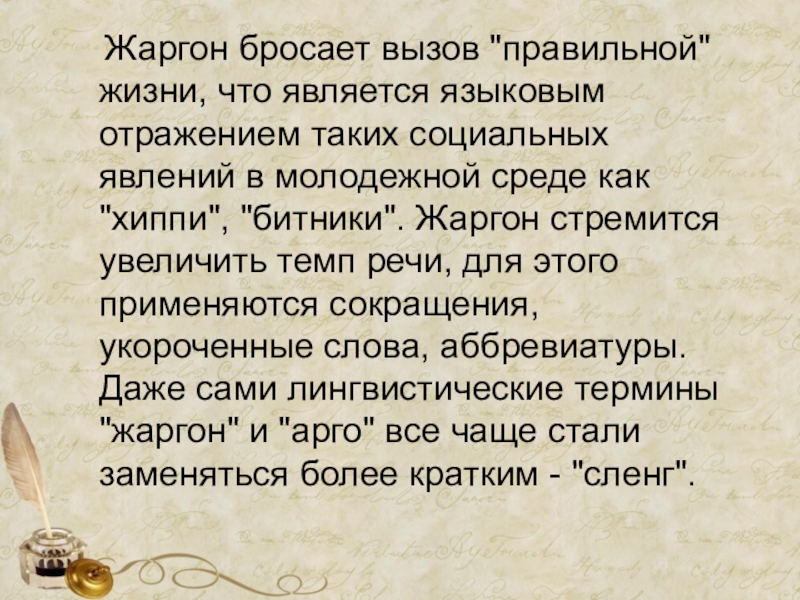 таких социальных явлений в молодежной среде как "хиппи", "битники". Жаргон стремится увеличить темп речи, для этого применяются сокращения, укороченные слова, аббревиатуры. Даже сами лингвистические термины "жаргон" и "арго" все чаще стали заменяться более кратким - "сленг".
