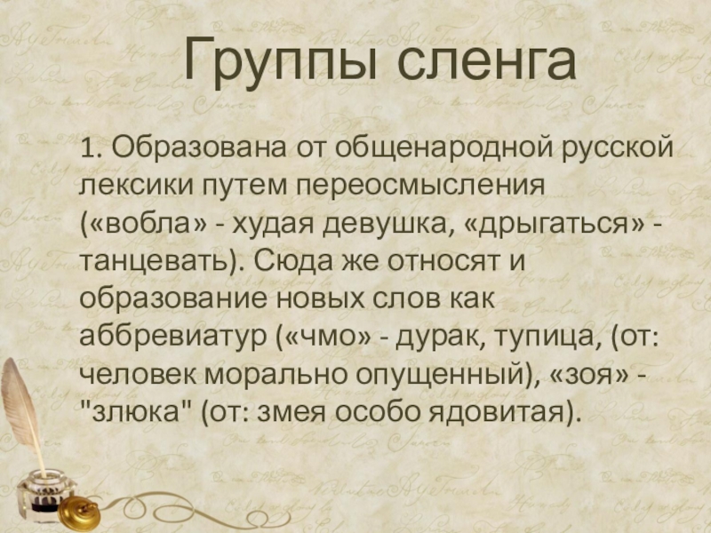 худая девушка, «дрыгаться» - танцевать). Сюда же относят и образование новых слов как аббревиатур («чмо» - дурак, тупица, (от: человек морально опущенный), «зоя» - "злюка" (от: змея особо ядовитая).