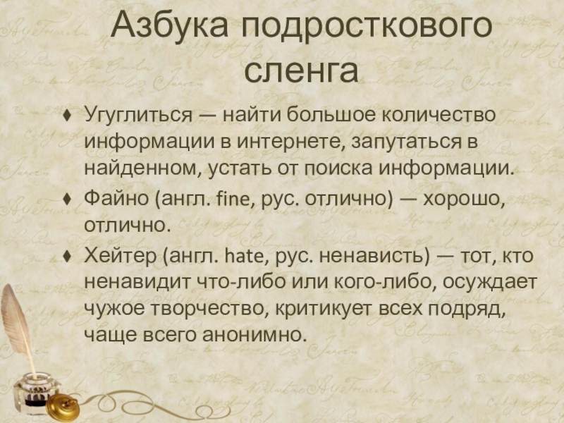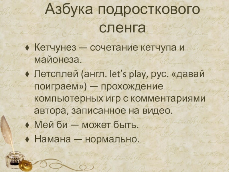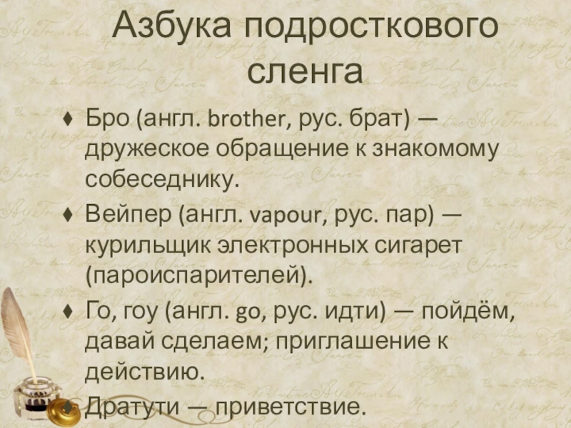 - его американского варианта). «Зипер» - молния, «герла» - девушка, «мэн» - парень, «бёздник» - день рождения, «выдринкать» - выпить, «пати» - вечеринка, «тату» - татуировка.