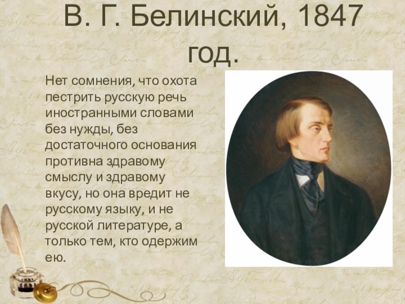 иностранными словами без нужды, без достаточного основания противна здравому смыслу и здравому вкусу, но она вредит не русскому языку, и не русской литературе, а только тем, кто одержим ею.