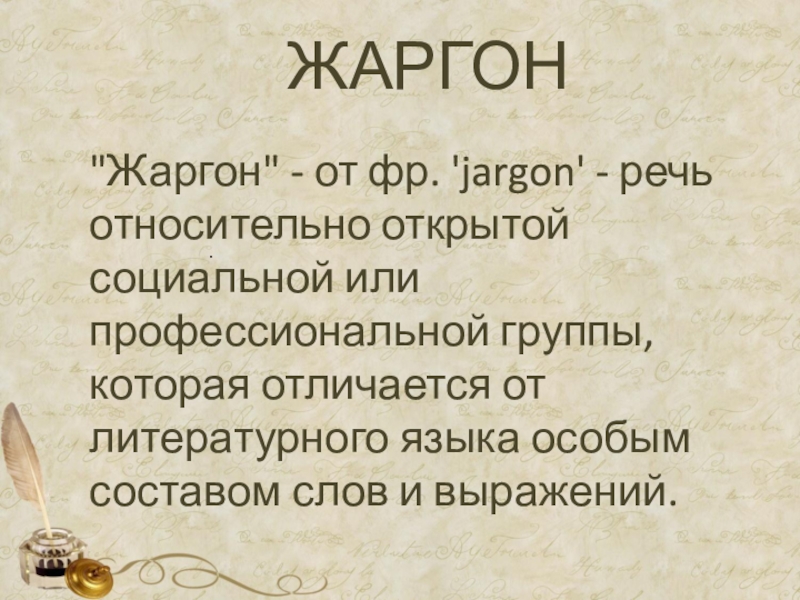 "Жаргон" - от фр. 'jargon' - речь относительно открытой социальной