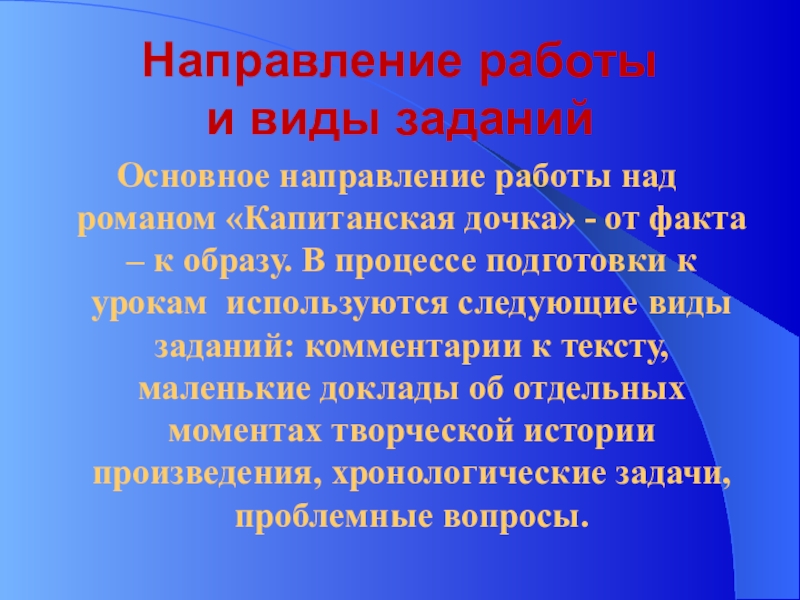 - от факта – к образу. В процессе подготовки к урокам используются следующие виды заданий: комментарии к тексту, маленькие доклады об отдельных моментах творческой истории произведения, хронологические задачи, проблемные вопросы.