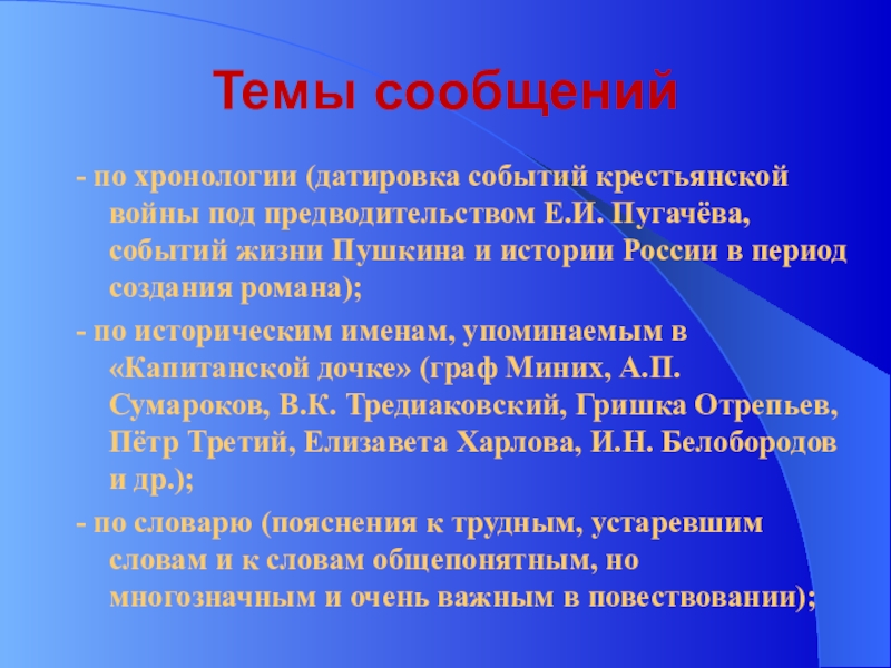 - по историческим именам, упоминаемым в «Капитанской дочке» (граф Миних, А.П. Сумароков, В.К. Тредиаковский, Гришка Отрепьев, Пётр Третий, Елизавета Харлова, И.Н. Белобородов и др.);