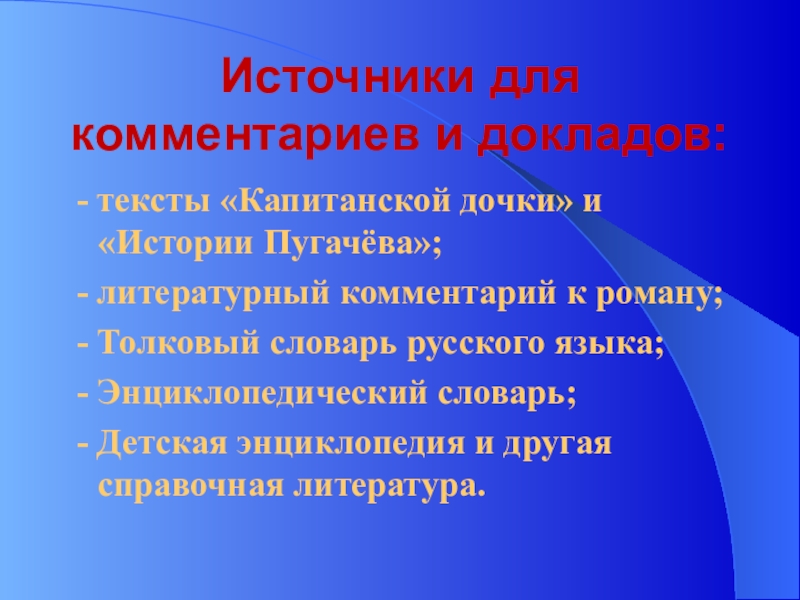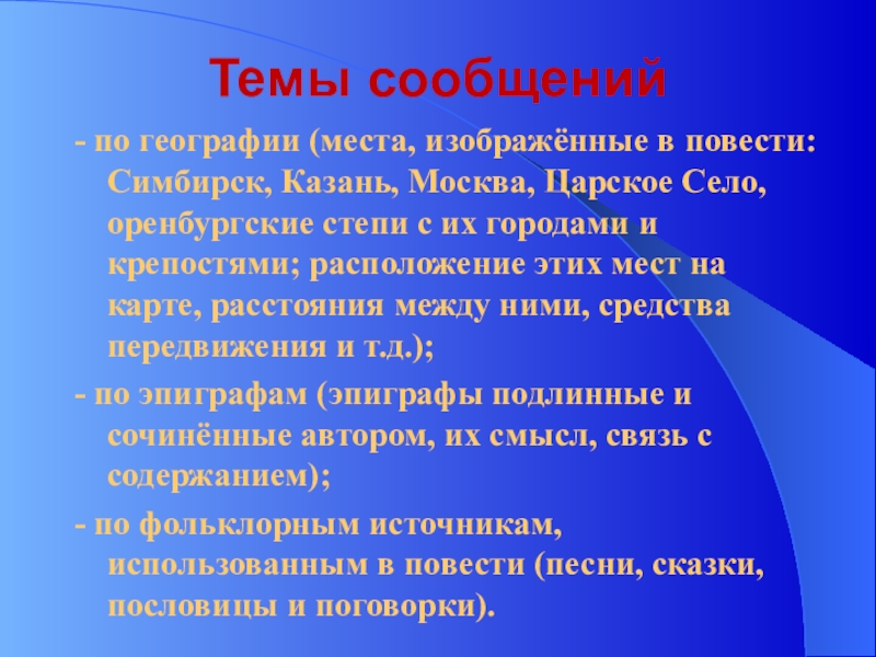 - по фольклорным источникам, использованным в повести (песни, сказки, пословицы и поговорки).