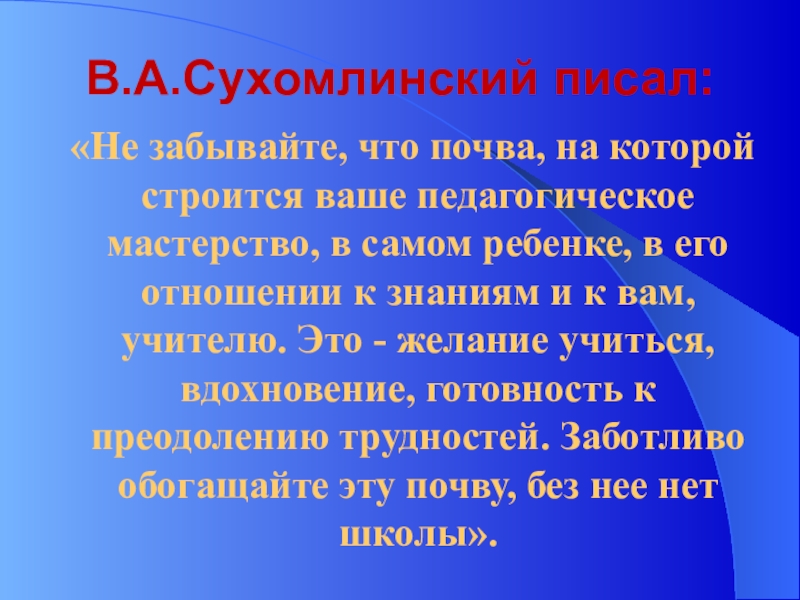 мастерство, в самом ребенке, в его отношении к знаниям и к вам, учителю. Это - желание учиться, вдохновение, готовность к преодолению трудностей. Заботливо обогащайте эту почву, без нее нет школы».