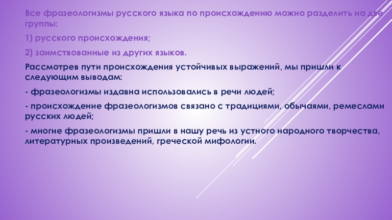 Слайд 9Все фразеологизмы русского языка по происхождению можно разделить на две группы:
