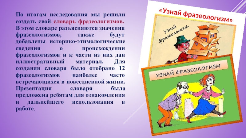 Слайд 12По итогам исследования мы решили создать свой словарь фразеологизмов. В этом