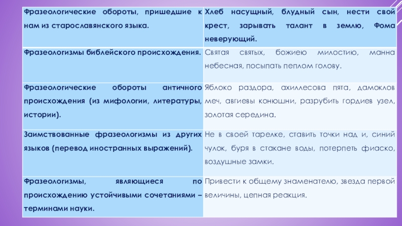 - многие фразеологизмы пришли в нашу речь из устного народного творчества, литературных произведений, греческой мифологии.