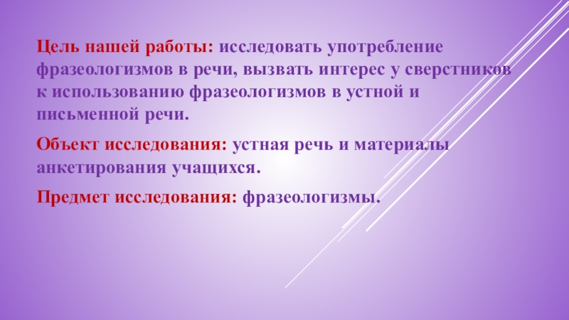 Слайд 3Цель нашей работы: исследовать употребление фразеологизмов в речи, вызвать интерес у сверстников